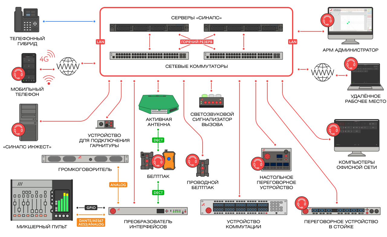 Ядром выступают основной и резервный серверы с установленным приложением Synapse Server. Они объединены по схеме горячего резерва, переключение с одного сервера на другой происходит незаметно для абонента. Как сервер можно использовать ПК с установленной ОС Windows 10,